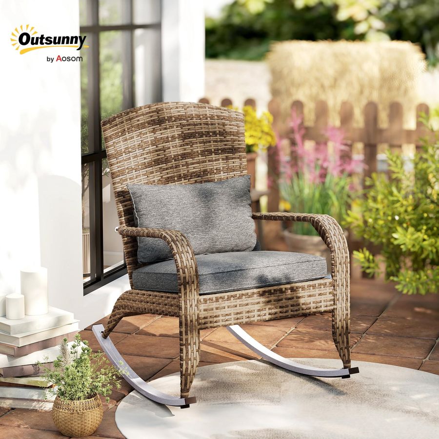 Outdoor Wicker Adirondack Rocking Chair, Patio Rattan Rocker Chair with High Back, Seat Cushion, and Pillow for Garden, Porch, B